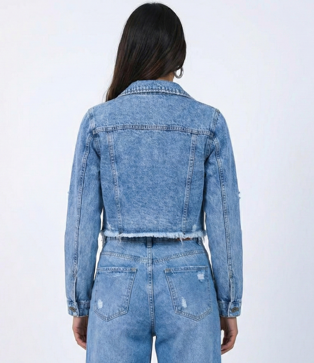 Cropped and distressed for that cool, lived-in look—our ripped denim jacket is made to stand out.